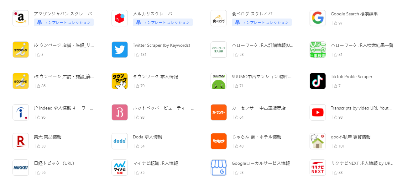 Amazon、Google、ニュースサイトなど用途別テンプレートを利用するだけでデータ収集が可能。URLやキーワードを入力するだけで、初期導入のハードルが大きく下がります。