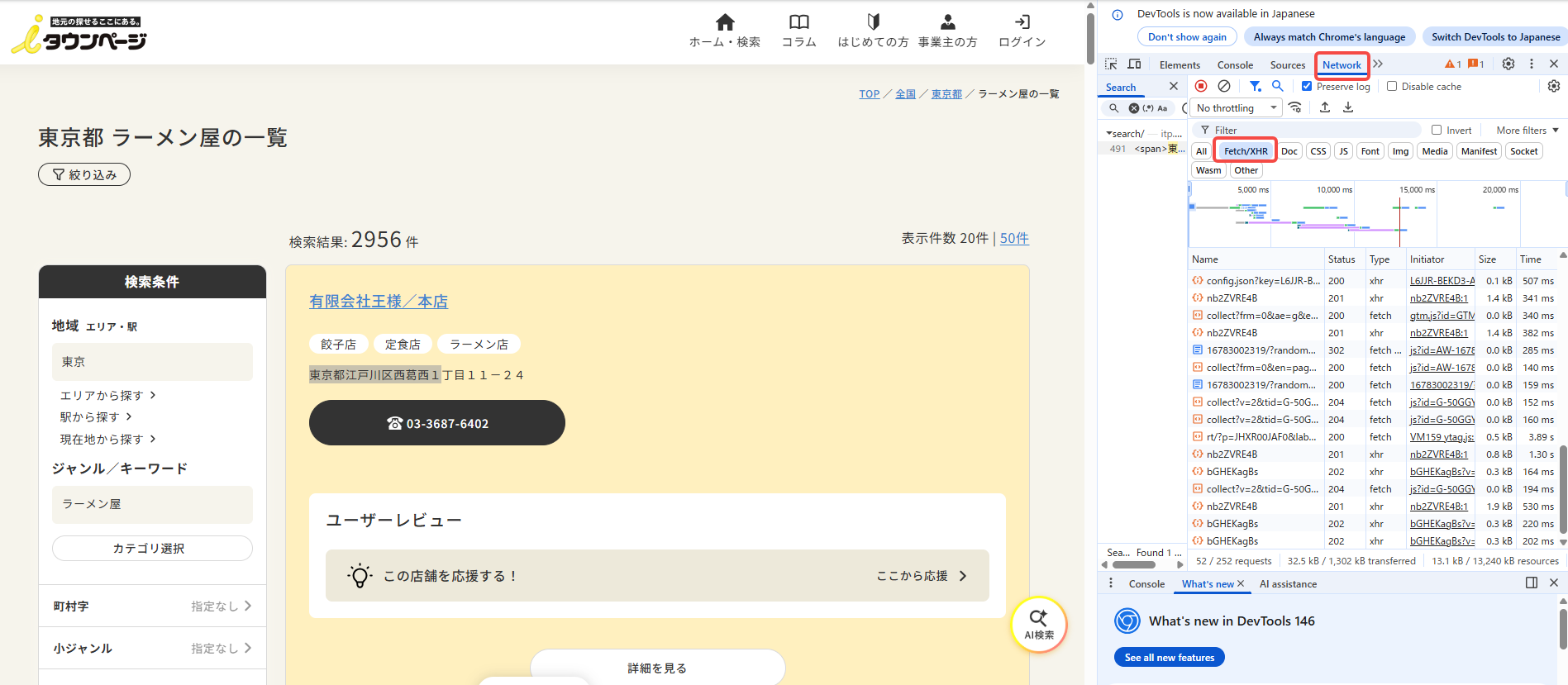 このような場合、画面に表示されているデータは、裏側で別のURLやAPIから取得されていることがあります。つまり、Ajaxデータ取得とは、こうした非同期通信で取得・表示されているデータを見つけて収集することです。