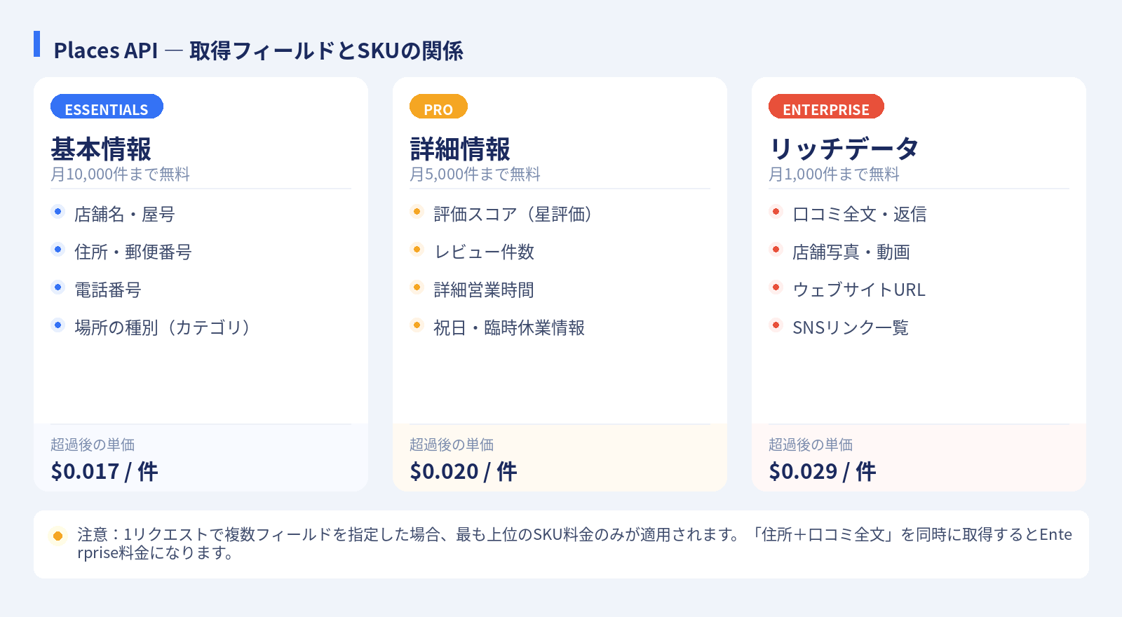 ※ 上記はPlace Details API(詳細フィールド含む)の概算。フィールド選択やSKUカテゴリによって変動します。