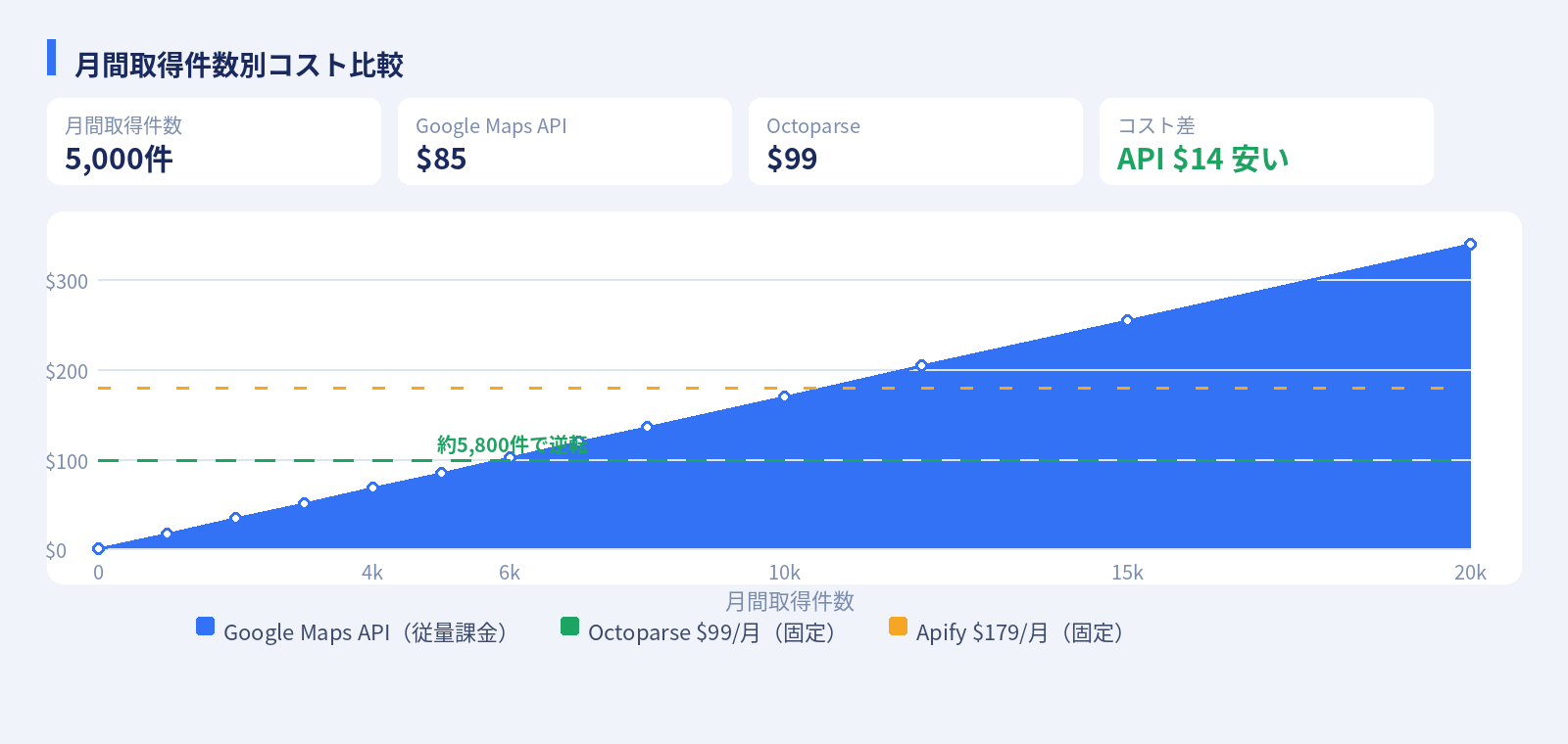- 月間5,800件超:OctoparseのほうがAPIより1件あたりコストで下回る(逆転点)