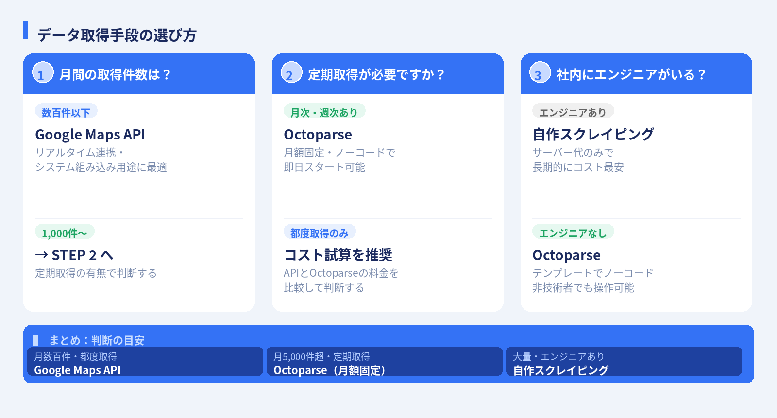 判断の軸は「月間取得件数」と「定期取得の有無」の2つです。月数百件の都度取得ならAPIがシンプル。月5,000件超かつ継続取得が必要なら、Octoparseのような月額固定ツールか自作スクレイピングのほうが費用対効果で優れるケースがほとんどです。
