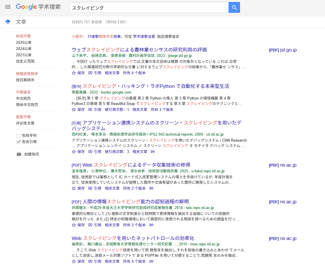 - 学術的な研究でもスクレイピングは広く活用されており、Google Scholarにおいても関連する700件以上の研究が確認できます。非商業的な目的であれば、一般的に合法と見なされますが、利用規約やプライバシー法を遵守し、個人情報の取り扱いに十分な注意が必要です。