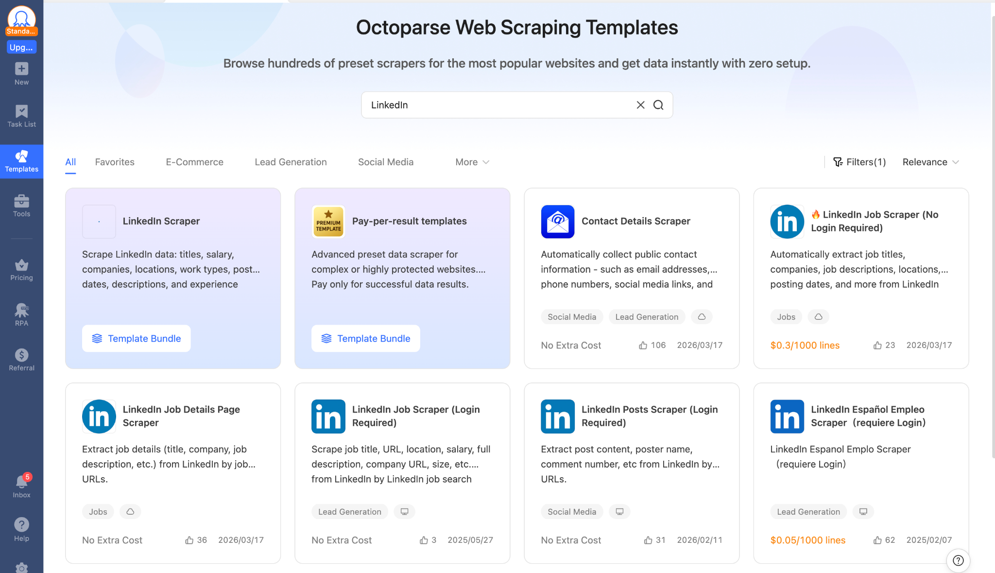 OctoparseのLinkedInテンプレートを使えば、自分で設定することなく、誰でも簡単にLinkedIn上のデータを取得することができます。LinkedIn関連のテンプレートはいくつか用意されているため、欲しいデータにあったテンプレートを選択してください。