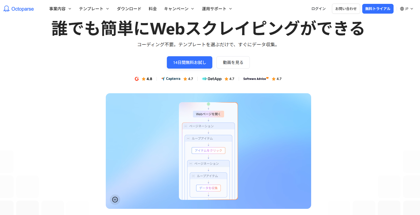 Octoparse(オクトパース)は、ノーコードで扱えるWebスクレイピングツールです。直感的な操作だけで、あらゆるWebサイトのスクレイピングプロセスを構築・実行できます。さらに、あらかじめワークフローが設計されている「タスクテンプレート」を使用すれば、URLを貼り付けるだけでAmazonや価格ドットコムなどのECサイトから価格情報を取得できます。