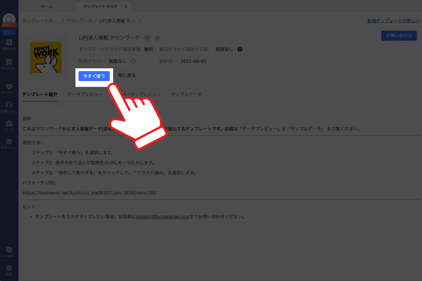 ここからがOctoparseのすごいところです。Octoparseでは、タウンワークから求人情報を収集するためのテンプレートタスクを用意しています。