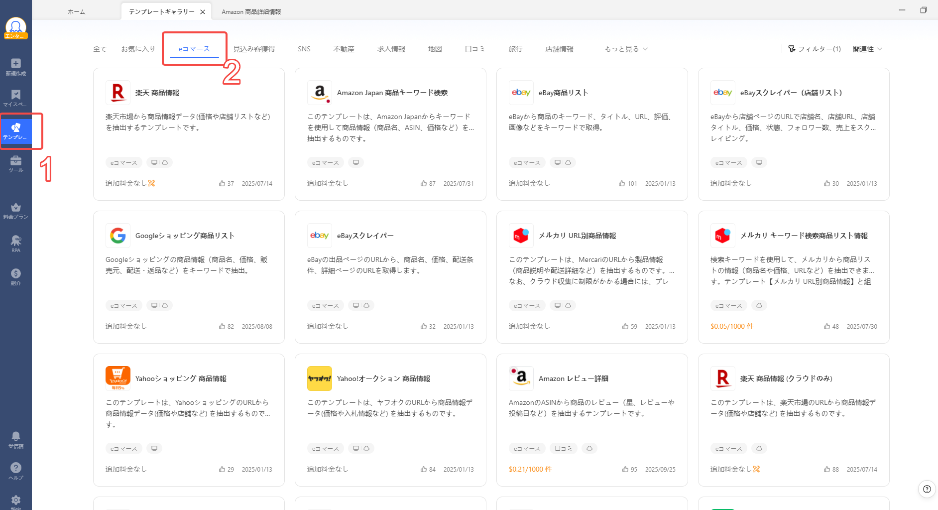 Octoparseをダウンロードした後、テンプレートボタンをクリックすると、主要な通販サイト向けの多様なテンプレートが一覧で表示されます。