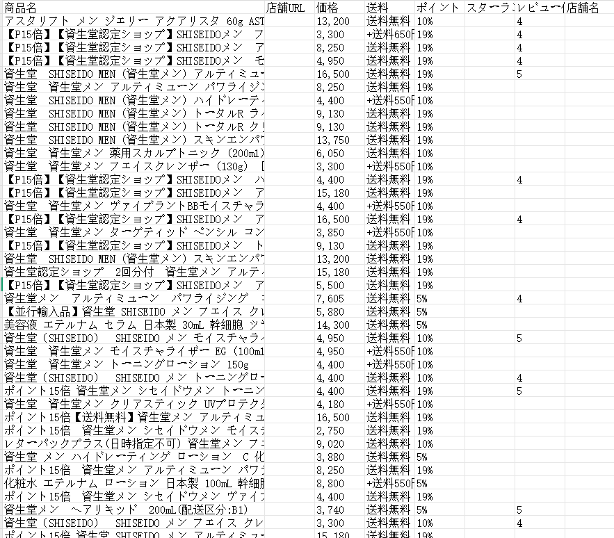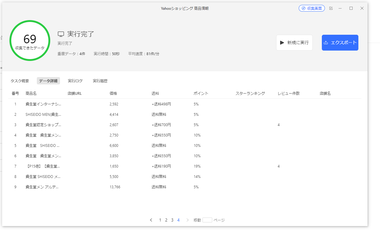 「実行」ボタンを押すと、自動的に商品データの収集を開始します。数秒ほどでデータ収集が完了します。ここでは、いくつかの商品価格を例として使用しています。