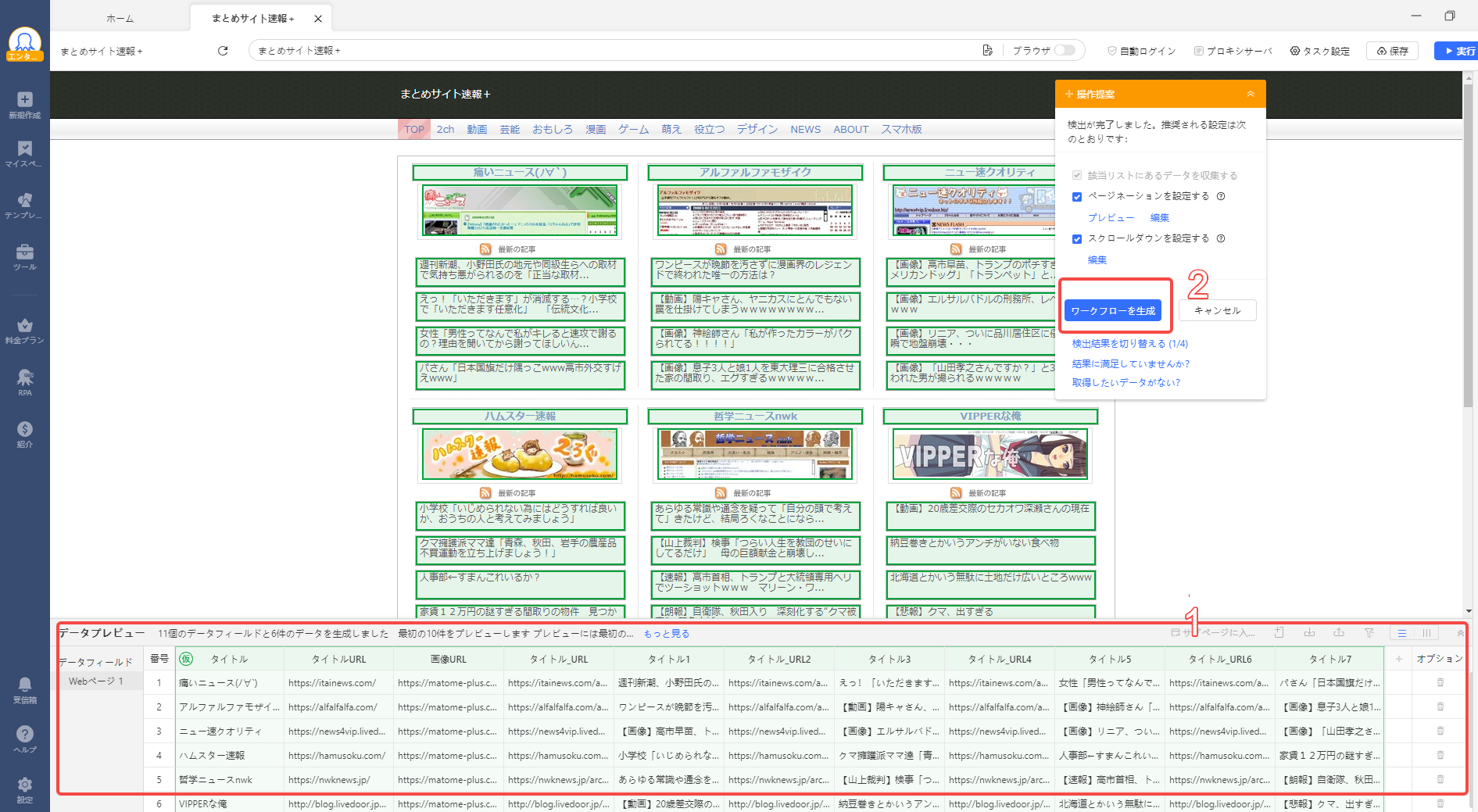 画面右側には、Octoparseが自動で作成したワークフローが表示されます。