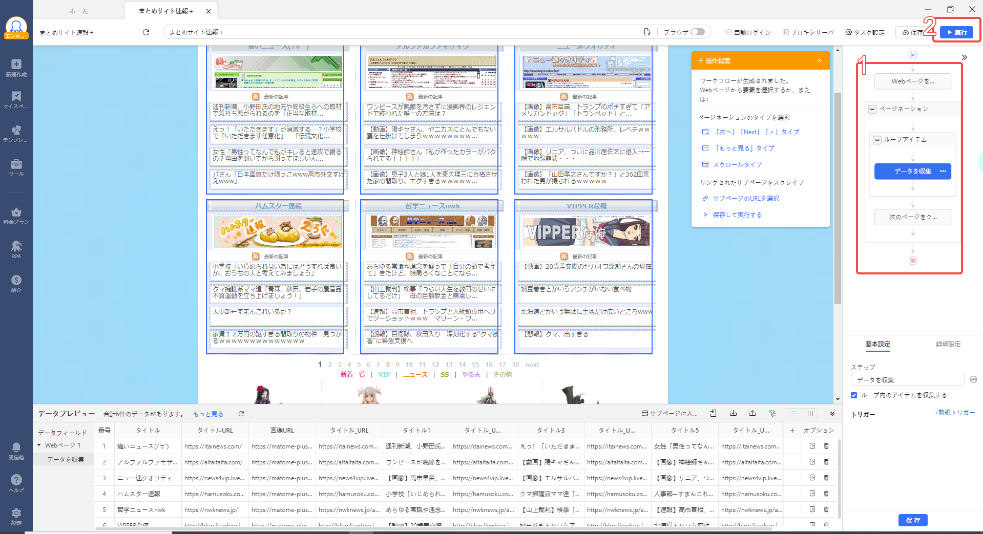Octoparseの「カスタマイズタスク」を用いれば、プログラミング不要で大量のデータを自動収集可能です。自動識別機能により、複雑な設定は不要で、画面上の要素をクリックするだけでタイトルやリンクを一括抽出できます。