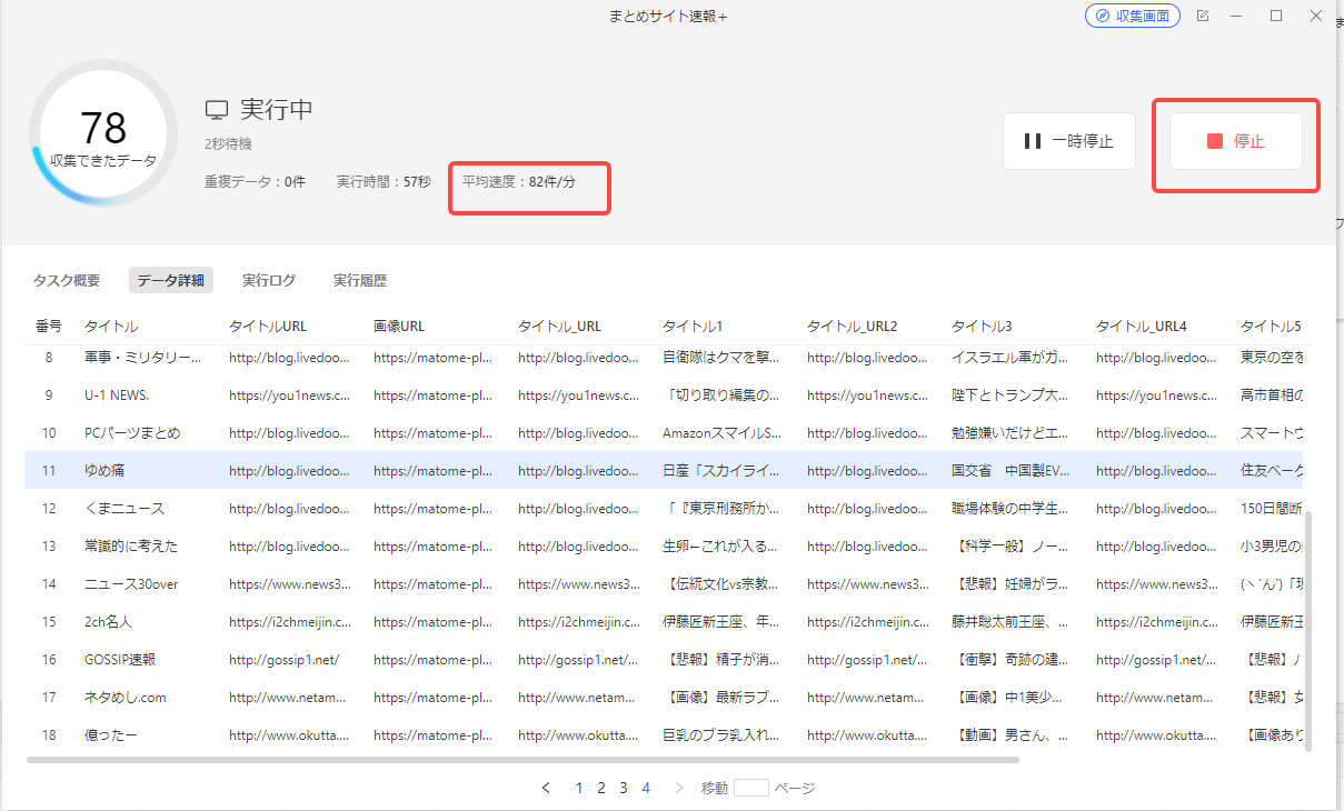 こちらはタスク実行中の画面です。Octoparseは1分で数百件のタイトルを自動で収集・記録でき、手作業で探すよりもずっと効率的です。