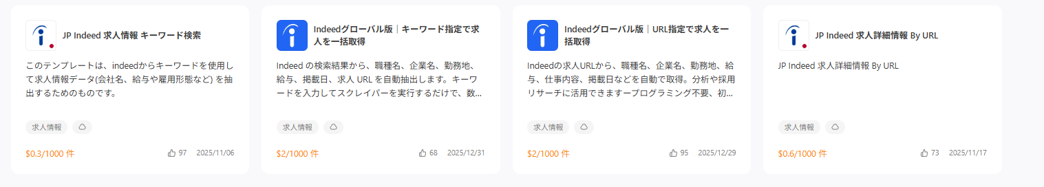 Indeedのテンプレートは、検索方法 × 取得範囲の違いによって、以下の4種類に分かれています。